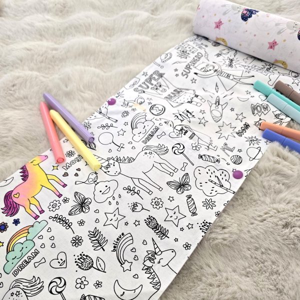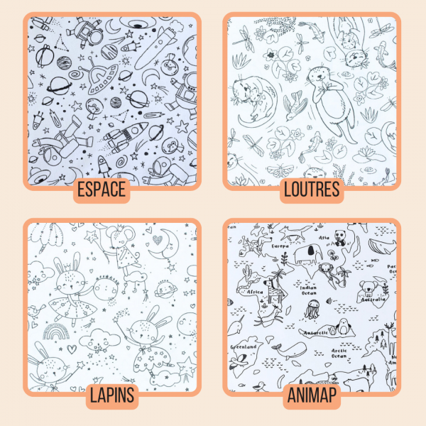 Cet article est vendu à l’unité et sans feutres : chaque feuille est vendue séparément afin de vous permettre de compléter votre rouleau. Les feuilles sont composées d’une face en coton à colorier (motif ou uni) et d’une face en coton déco dans le thème du motif à colorier. Elles peuvent être attachées les unes aux autres (pour former un rouleau), il est donc possible de commander de nouvelles feuilles ultérieurement. A utiliser avec des feutres lavables / supers lavables.