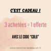 Offre « 3 feuilles achetées = 1 offerte » : pour en bénéficier, ajoutez au minimum 3 feuilles à colorier à votre panier. Le code promo s’applique automatiquement. Et en plus, il est répétitif ! Autrement dit, 3 feuilles achetées = 1 offerte, 6 feuilles achetées = 2 offertes et ainsi de suite. Rendez-vous ensuite sur votre panier (l’icone apparait en haut à droite du site) pour sélectionner le motif de vos feuilles offertes.